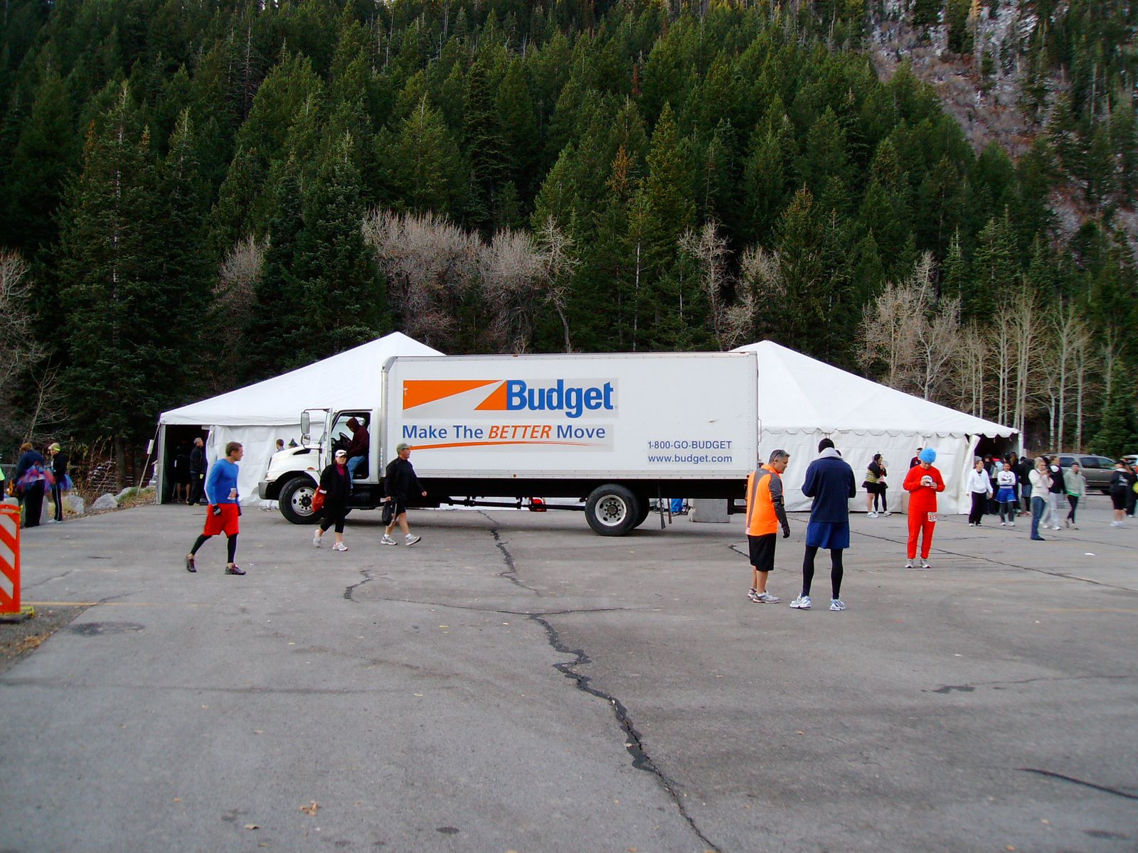 We woke up at 5:00 and got ready. The temperature was supposed to be around 34 degrees when the race started at 9:00 a.m. They had to bus 2,500 people up to the start of the race which was located at Sundance Ski Resort. We made it to the starting area around 7:15 a.m. They had 2 large tents set up with propane heaters so everyone could stay warm until the race started. While people were waiting they had costume contests.
